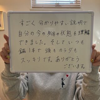 【内容】 更年期の症状でお伺いしました。雰囲気も良く、先生も穏やかで安心できました。私の話しを親身に聞いてくださり、丁寧に施術してくださりました。 鍼をしていただくと、身体が軽くなり、心も軽くなりました。 これからも通い続けたいと思います。...