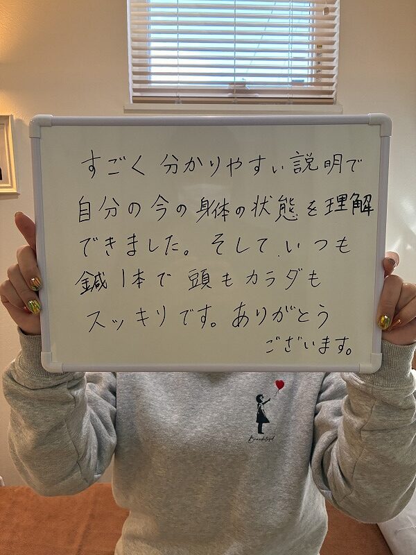【内容】 慢性的な頭痛に悩んでいましたが、施術を受けて改善を実感しています。説明も施術も非常に丁寧で説得力があり、とても良かったです。自分の身体のことを知り、納得して施術を受けたい人におすすめです。
